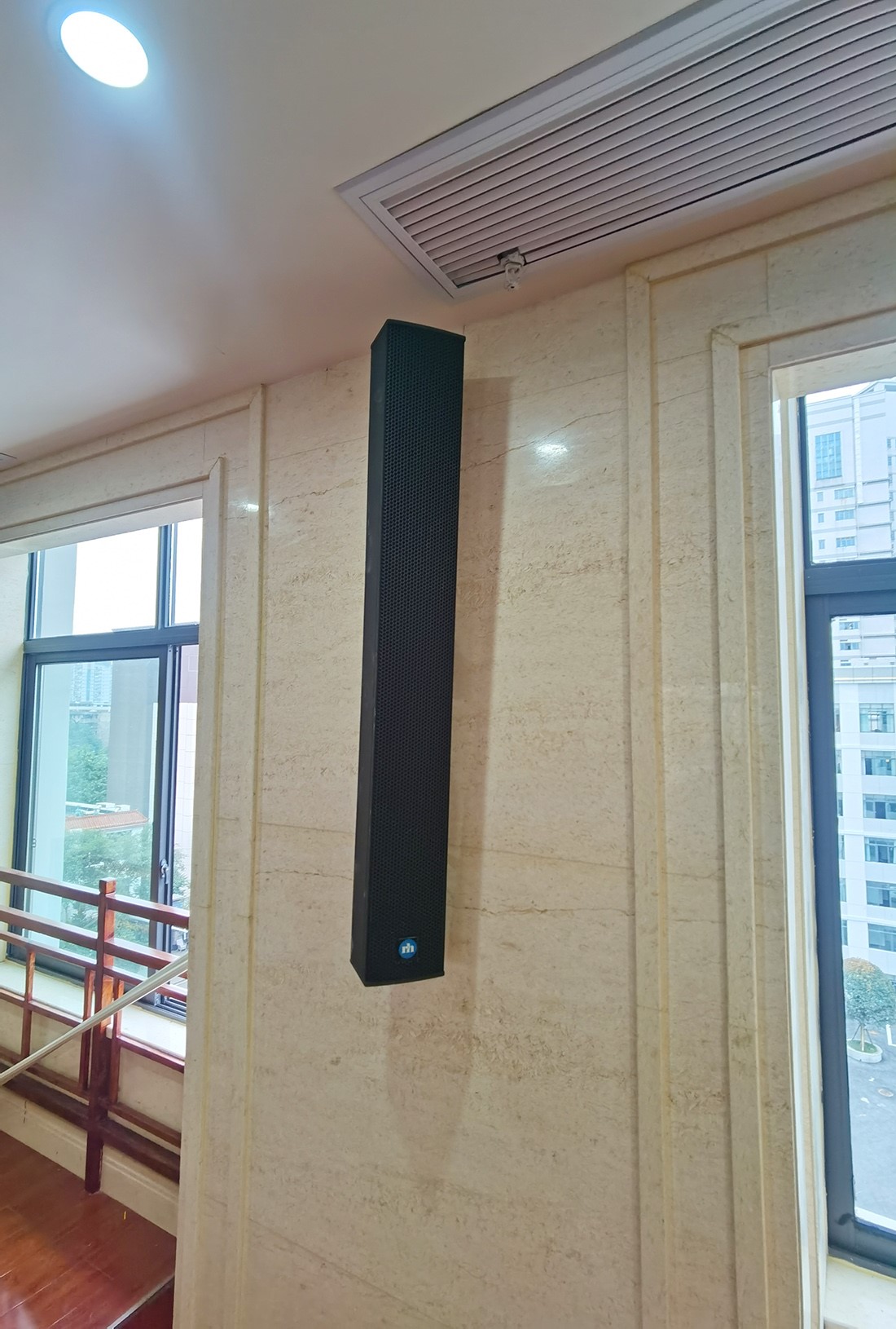 系統(tǒng)選用了Renkus-Heinz IC8可調(diào)指向波束有源音柱揚(yáng)聲器作為主擴(kuò)揚(yáng)聲器。其優(yōu)勢(shì)在于經(jīng)過長距離的投射,聲壓級(jí)下降速度更緩慢,IC8可調(diào)指向波束有源音柱揚(yáng)聲器通過控制波束的形狀、垂直高度和投射角度,可以調(diào)整音柱的發(fā)聲中心,創(chuàng)造不對(duì)稱波束或多波束,解決了由于音柱安裝位置高,導(dǎo)致無直達(dá)聲,且部分區(qū)域易低頻嘯叫的會(huì)議弊端。