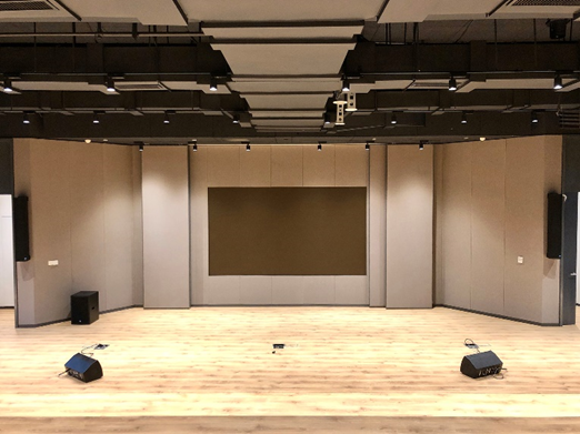 小劇場要求具備會(huì)議、多媒體播放,以及小型演出等功能。天創(chuàng)工程師為小劇場配置了Renkus-Heinz ICLive系列可調(diào)指向性音柱揚(yáng)聲器,配合Renkus-Heinz C系列超低揚(yáng)聲器和返聽揚(yáng)聲器,輔以吸頂揚(yáng)聲器,保證了全場的聲音覆蓋。特別是C系列常規(guī)揚(yáng)聲器,其復(fù)合圓錐號(hào)角可以在全頻段范圍內(nèi)提供一致寬度的波束,具有很高的靈敏度和聲壓級(jí)。干凈的聲音在多媒體播放和小型演出時(shí),有更佳豐富的表現(xiàn)。